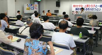 午後5時より千葉県市川市のみなさんが開いてくれた「青木かずみ・上原ひろ子と一緒に国政を変える市川の集い」(市川教育会館)で挨拶。参加者約50名。青木さんは、学校の先生だった方で今回、千葉選挙区の参議院予定候補。先日、千葉駅頭での辻元清美さんらとの街頭演説会でもすばらしい歌を披露していたが、今日も熱い決意表明の最後に素敵な歌で会場を和ませてくれた。