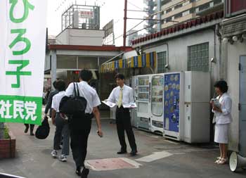 夜は、まず中野勤労者福祉会館で行われた労働者フォーラム東京の集会に、東京選挙区の杉浦ひとみさんと一緒に参加しました。参加者の前で、「今、年金問題が選挙の争点となっているが、それに目を奪われて憲法改悪を忘れないでほしい。今回当選する議員の任期は6年。自民党が3年後に憲法改定の発議を目指す、と言っているのだから、確実に発議を国会で行うか、行わないか、の選択に係わるのだから」と訴えてきました。