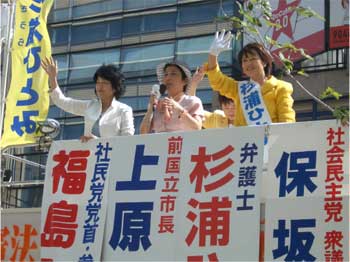 その後、銀座へ移動し、和光前で、市民に支援を訴えました。社民党の福島みずほ党首もご一緒。さすがに、福島さん、人気者でいらっしゃる。そばを通る若い女性たちが、わっと福島さんを取り囲みました。うーん、ここまで顔を浸透させなきゃ選挙は難しい、と決意も新た。